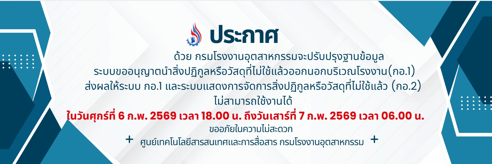 หากผู้ประกอบกิจการโรงงานท่านใด ต้องการคำแนะนำหรือพบปัญหาเกี่ยวกับการเข้าใช้งานระบบ